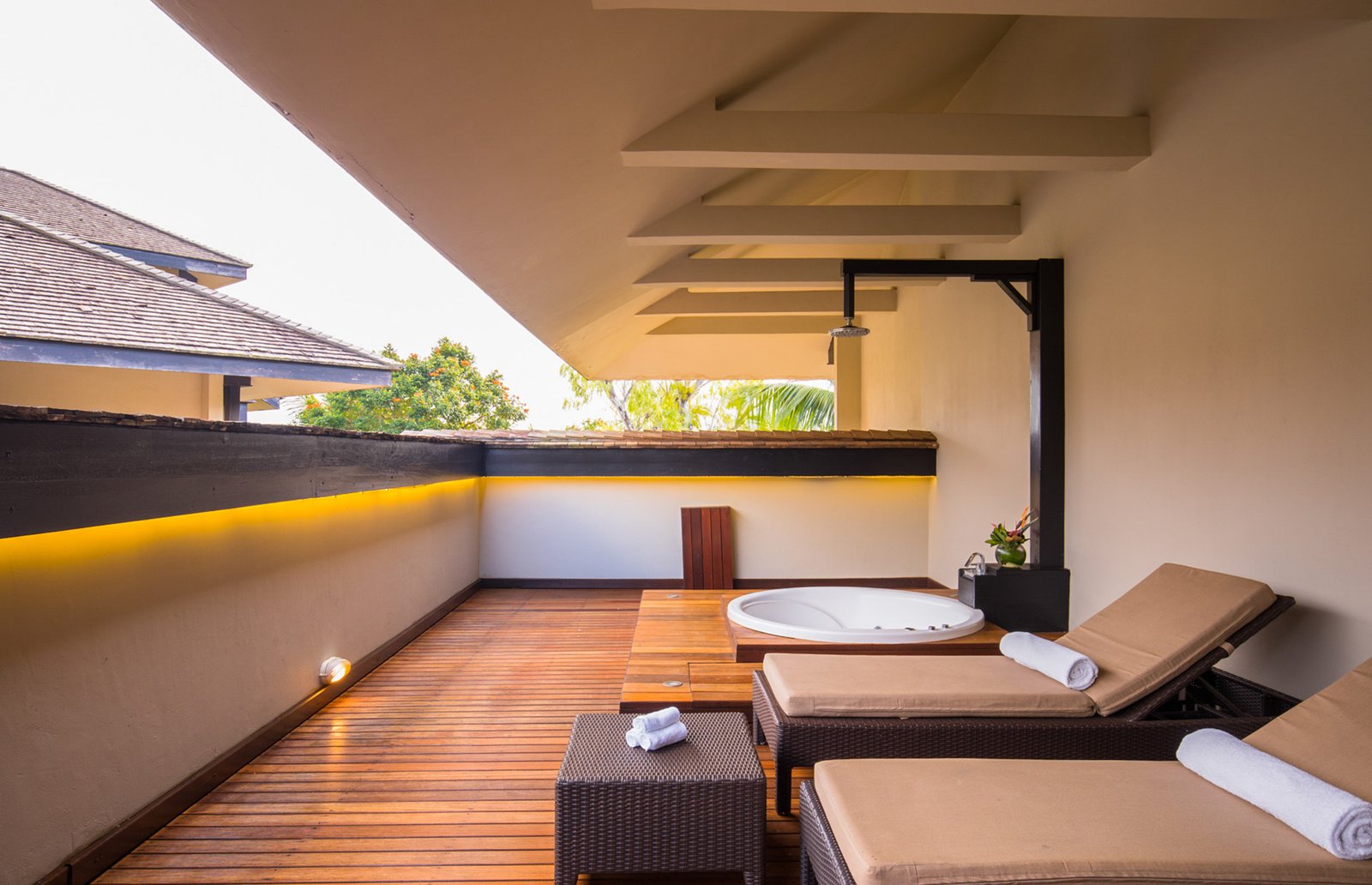 Nos Suites Terrasse de 89 m², plus connues sous le nom de Suites Lune de Miel, disposent d'une terrasse privée accessible depuis la chambre et le salon, d'un lit king-size convertible en canapé, de grandes salles de bain avec baignoire et douche séparée, ainsi qu'un bain à jets extérieur avec chaises longues.